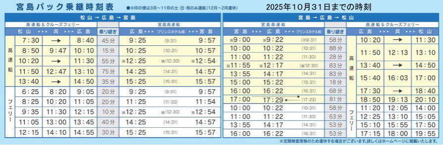 | ※フェリー「SEA PASEO」「SEA PASEO2」の運航予定に関しましては、 瀬戸内海汽船ホームページ内の運航予定表をご覧ください。 |