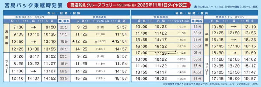 ![]() ![]() ※2025年11月1日(土)より、松山〜呉〜広島航路(高速船スーパージェット及び旅客フェリー)のダイヤ改正を実施いたします。 ご乗船時間は事前にご確認の上、ご利用ください。 ![]() <その他のご案内> ※ご出発日はお決めください。出発時刻は自由に設定できます。 事前にご予約していただき、切符購入をしてください。詳しくはお問い合わせください。 ※添乗員は同行しませんので、ご旅行中の諸手続きはお客様自身で行って頂きます。 ※当日、港窓口でのフェリーからスーパージェットへは追加料金で変更できます。 ※各店舗の休業日はお尋ねください。 |